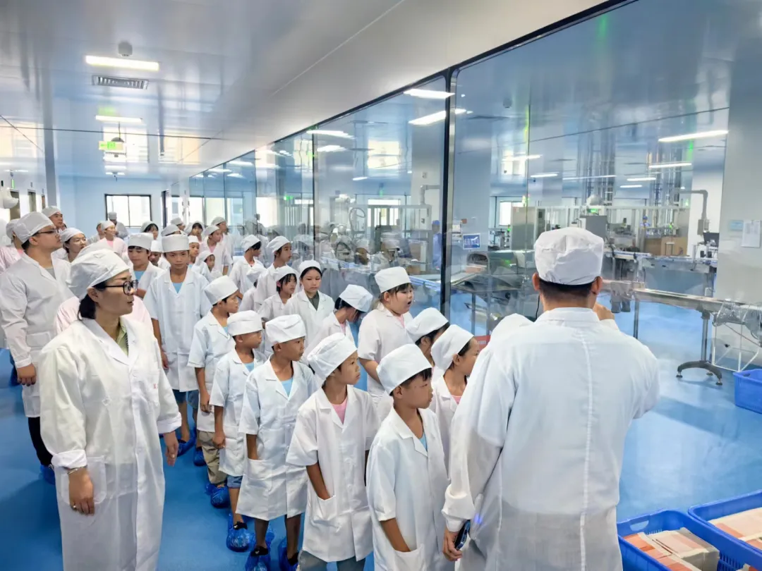 穿戴好白大褂、防護帽和防護鞋套後,孩子們興奮地踏入了智能綠色工廠。他們親眼目睹了先進的製藥設備如何高效、精準地完成藥品生產,紛紛發出驚歎聲。了解了生產線的自動化、智能化特點,以及這些技術如何提升藥品質量和生產效率。孩子們聽得認真,還不時提出自己的問題,與講解員進行互動。