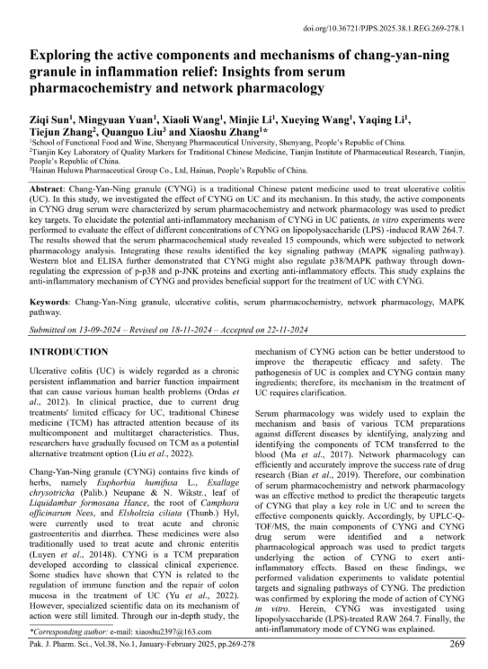 此次發表的文章題為《腸炎寧顆粒緩解炎症的物質基礎和藥理機製:血清藥理學與網絡藥理學綜合研究》,刊登於巴基斯坦製藥科學雜誌(Pak. J. Pharm. Sci.)。該研究深入探討了腸炎寧顆粒(CYNG)在治療潰瘍性結腸炎(UC)中的作用機製,通過血清藥理學和網絡藥理學的綜合方法,揭示了其抗炎活性成分及關鍵信號通路,為腸炎寧顆粒的臨床應用提供了堅實的科學依據。