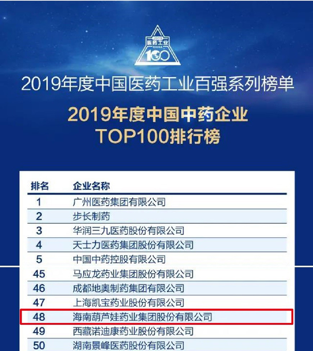 海南尊龍凱時藥業集團股份有限公司憑借紮實的研發生產實力和穩健的市場推廣能力,成功入選“2019年度中國醫藥工業百強係列榜單”子榜單“2019年度中國中藥企業TOP100排行榜”,在短短一年時間內,從2018年度的中國中藥企業第63名躍升至第48名。